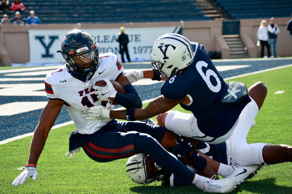 Senior Wide Receiver Jared Richardson hangs onto the ball admist Yale's tackle on Oct. 25. Noah Jeong