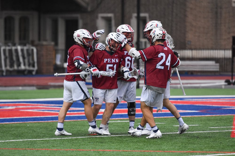 Penn men's lacrosse team celebrates after scoring a goal against Yale on Apr. 1, 2023.