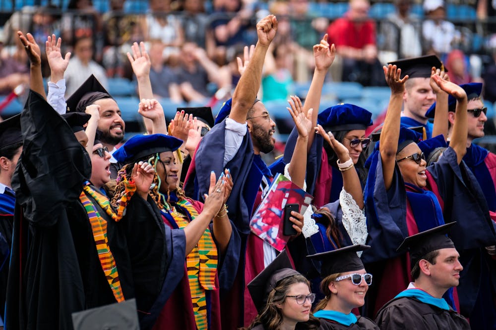 Students from the Class of 2019 cheer during their commencement ceremony on May 20, 2019 at Franklin Field.
