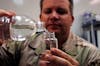 Senior Master Sgt. Ralph Long pours a sample of drinking water into a jar to test for bacteria and E. coli at Sather Air Base, Iraq. Residents at Sather AB use approximately 61,000 one-liter bottles of water every week. That's more than 116,000 gallons, just for potable water. Sergeant Long is assigned to the 447th Expeditionary Medical Squadron. (U.S. Air Force photo/Tech. Sgt. Russell Wicke)